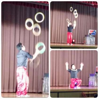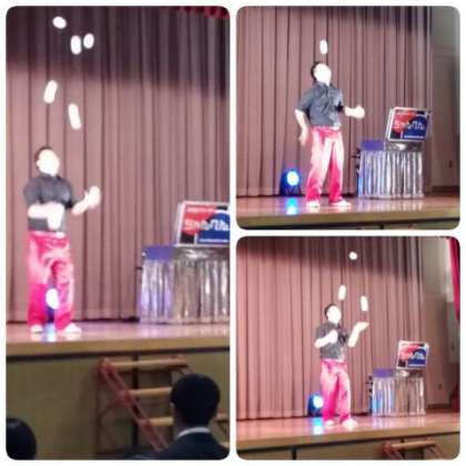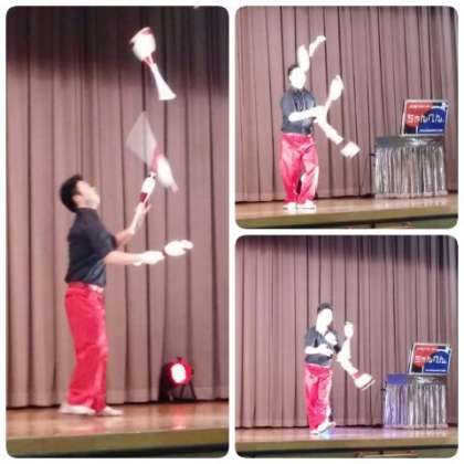 続いて、ボール、リング、クラブを使ってのトスジャグリングの演技、技のすごさに子どもたちは食い入るように見ていました。