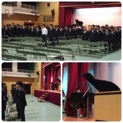 全体の通し練習が終わり、6時間目の後半は、音楽科・林田先生の指導のもと、式歌「道」と「蛍の光」の練習に取り組みました。