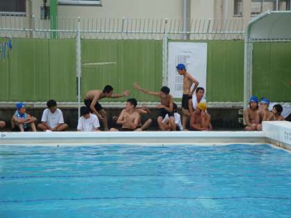 左の写真は、リレースタート前の様子です。右の写真は、2組の芸術的な応援です。「盛り上がるよね〜」