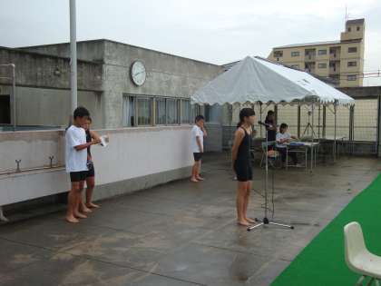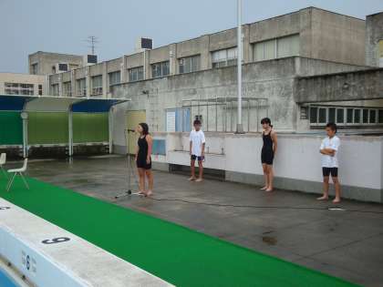 本日、午前中に1年生の『水泳大会』が行われました。あいにく天候には恵まれませんでしたが、子どもたちは本当によく頑張りました。水泳が不得意な子どもも「頑張って泳いでみよう」と思えるような1年生全体のあたたかい雰囲気を感じました。写真は、開会式の様子です。以下に、本日の『水泳大会』の様子を掲載していますので、ぜひ、ご覧ください!