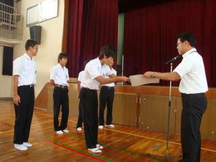 9月6日(土)に本校で実施されました『第7ブロック水泳競技大会』の賞状伝達を全校集会で行いました。400mフリーリレー第3位(水野、渡部、横山、田之上)、200mバタフライ第3位(田之上)、200m平泳ぎ第3位(横山)、100m背泳ぎ第3位(奥田)という結果でありました。「おめでとうございます!」