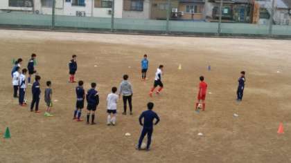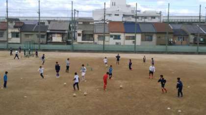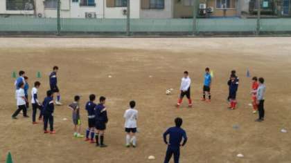 10連休初日の4月27日(土)、グランドではサッカー部が練習していました。顧問からの説明の後、3カ所に分かれてパスを出してから空いているスペースに走りこむ練習をしていました。