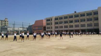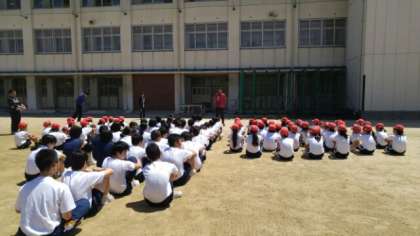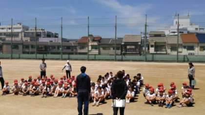 5月8日(水)3限、気持ちの良い晴天のもと梅南津守小と松之宮小の5年生児童を迎え、合同で50メートル走の計測会を実施しました。