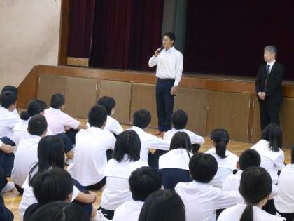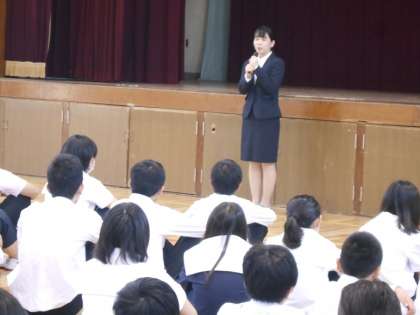 本日より3週間、教育実習が行われます。全校集会で、実習生の方から挨拶がありました。教科は理科で、担当学級は3年1組です。また、毎週月曜日に来てくださるサポーターの方の紹介もありました。どうぞよろしくお願いします。