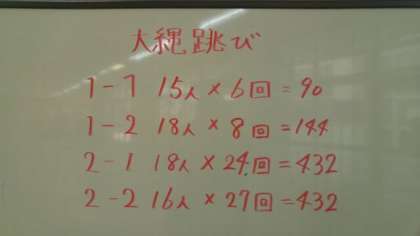5月22日(水)昼食時、食堂のホワイトボードには体育の授業で実施している体育大会の種目である大縄跳びの練習結果が記入されていました。ご覧のように「跳んだ人数×回数」が得点となります。さすがに2年生は高得点ですね。