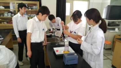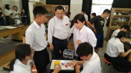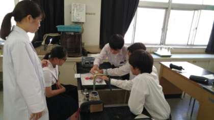 単元は、「化学変化とイオン」。この時間は「塩酸の電気分解」の実験です。たくさんの参観がありました。