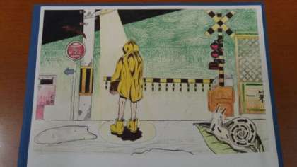 6月に入りました。今日、美術部員が校長室に「6月カレンダー」を届けてくれました。「黄色のレインコート、長靴の人が遮断機が上がるのを待っている絵」と思いきや、レインコートから覗いている左手は獣のようです。他にも矢印のいっぱい書かれたカタツムリ、昔風に右から書かれた「止まれ」、「7月」の看板、「化物語」と書かれた郵便ポスト、とよく見ると不思議な絵です。