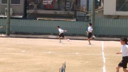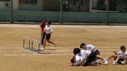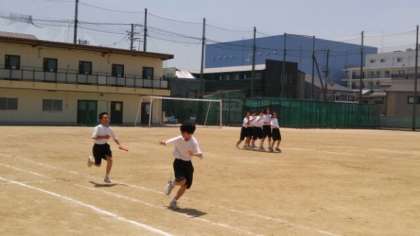 今日は、風がそよそよと吹いておりそれほど暑くありませんでした。みんな元気に取り組んでいます。写真では、ムカデが転んでいますが、ハードルやバトンパスも上手になってきているようです。来週の金曜日が楽しみですね。