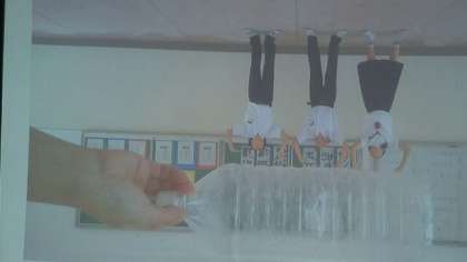 ひとがだんだん小さくなっていく「人間ダルマ」、人がペットボトルで逆立ちをしている「さかさまさん」、最後は、えんぴつに人が乗った「落ちる〜!」です。
