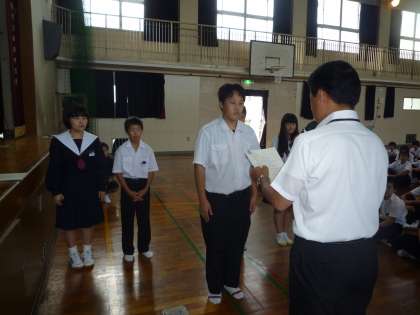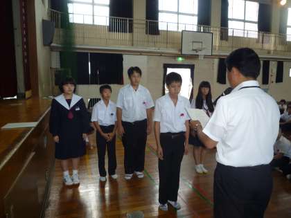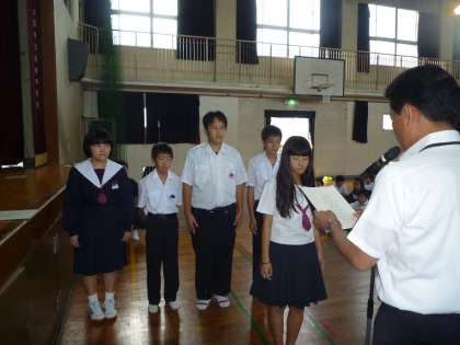 9月18日に行われました『後期生徒会役員選挙』の結果、5名の生徒会役員が選出されました。本日の全校集会で認証式があり、役員一人ひとりに認証状が校長先生から渡されました。新生徒会執行部のもと、さらに学校がひとつにまとまることを期待しています。