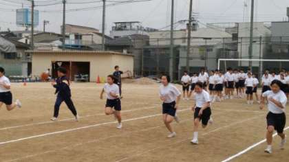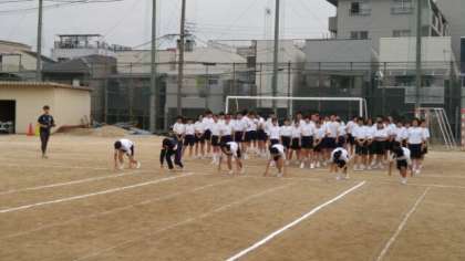 競技の部です。まずは、女子50メートル走です。今日は予行なので第1走者のみ通常の競技の形、第2走者以降は写真枚目のように集団で流しています。