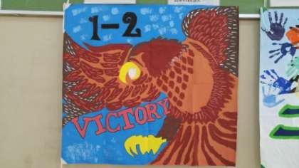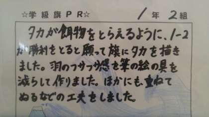 1−2の学級旗です。「タカが獲物を捕らえるように、1−2が勝利を取ると願って」タカをデザインしたとのことです。「羽のフサフサ感を筆の絵の具を減らして」描いたという力作です。