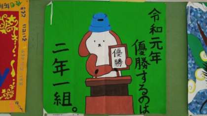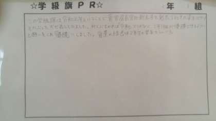 2−1の学級旗です。シンプルなデザインですが、新元号「令和」の発表をモチーフに描かれた作品です。2年生の学年カラーである緑色をバックに「額縁の中は、『令和』ではなく、2年1組が優勝できるようにと願いをこめ『優勝』にしました」とのことです。
