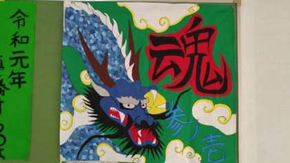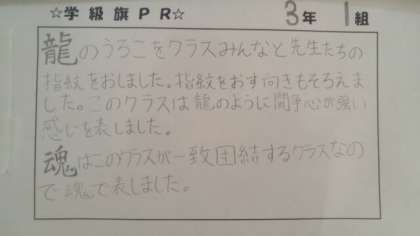 3−1の学級旗です。「竜のうろこをクラスみんなと先生たちの指紋」で作られているそうです。「魂は、このクラスが一致団結するクラスなの魂」で表したとのことです。龍の闘争心が表現されていますね。