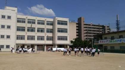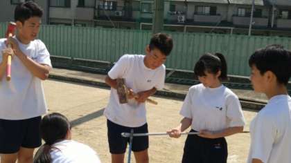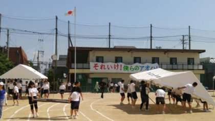 トラックの周囲にロープを巡らせるため、くい打ちをしています。テントの組み立ても次第に完成していきます。長机を運んでいる姿も見られます。