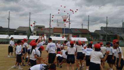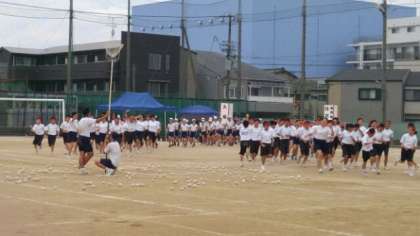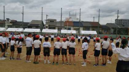 入場門から梅南津守小学校、松之宮小学校から6年生のみなさんが入場します。今年も小中合同玉入れが始まります。