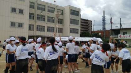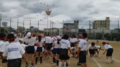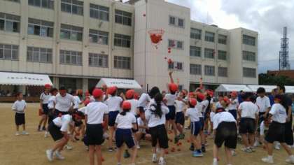 各小学校が、1−1または1−2とペアになって対戦します。どちらがたくさん入るのでしょうか。どんどん玉を投げ込んでいきます。