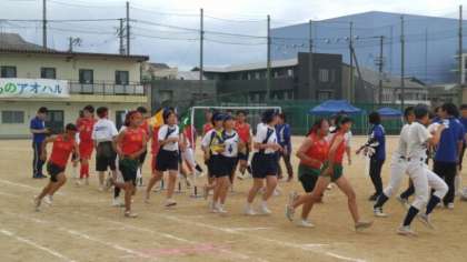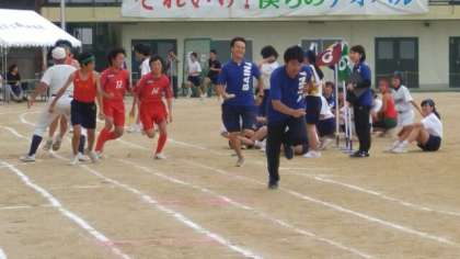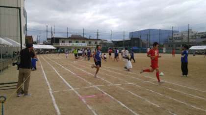写真1枚目では、先生チームが1位ですが、2枚目のゴールシーンでは、サッカー部が陸上部の追い上げをかわして1着でゴール!