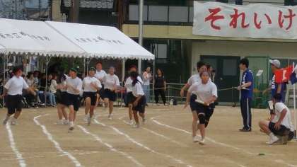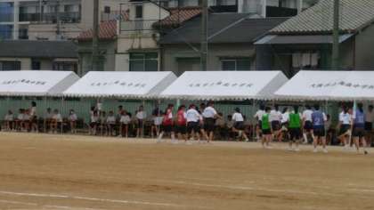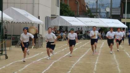 女子最後のリレー、400mリレーです。第1走者から第2走者へ、そして第2走者から第3走者へバトンが渡されます。3−2がリード、あとは接戦です。