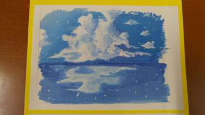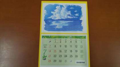 写真は、美術部員による7月のカレンダーです。青空に浮かび水平線に写る雲が描かれています。気持ちのいい風景ですね。