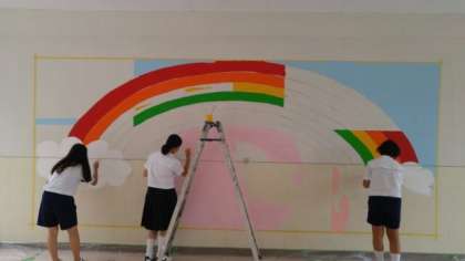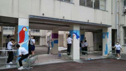 7月9日(火)1限の美術の時間の様子です。保健室横の壁と2年生校舎、3年生校舎の渡り廊下の6本の柱に着色しています。管理作業員さん等からも応援していただきながら高所は脚立や長椅子を使って着色しています。