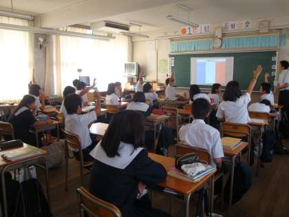 本日は、1限目に社会(1年1組)、3限目に体育(1年男子)、5限目に技術(2年1組)と英語(2年2組)の『校内研究授業』を実施しました。写真は、ICT機器を活用した『社会』の授業です!子どもたちが楽しく授業に参加していました。以下に本日行われました研究授業の様子をアップしておきますのでご覧ください。