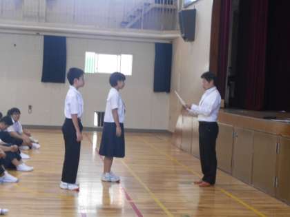 いくつか表彰の伝達があります。まずは2段目の写真です。夏休み前に募集した「夏季生活標語」で1年生男子1名、2年生女子1名が佳作を受賞しました。