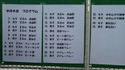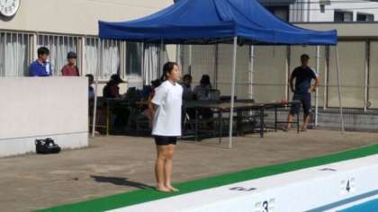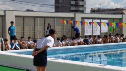 9月3日(火)、水泳大会が行われました。写真は開会式の様子です。好天に恵まれた中、まず生徒による「開会宣言」および「競技場の注意」と続きました。