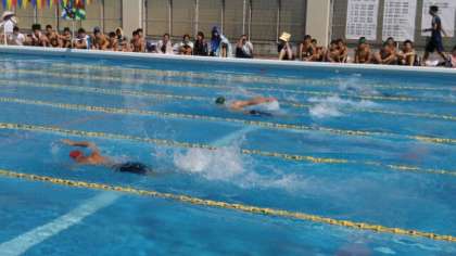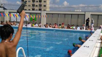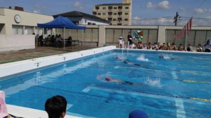 男子25m自由形第3レースの様子です。写真のようにスターターは生徒が行っています。