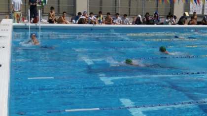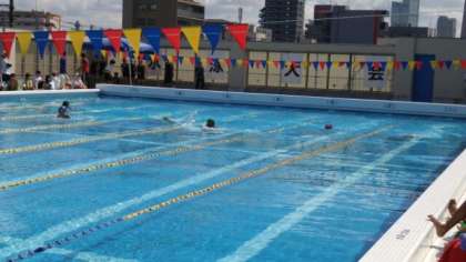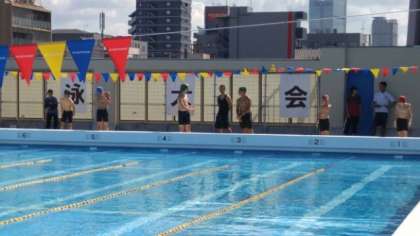 男子25m平泳ぎ第4レースの様子です。このレースは、3年生が大差をつけてゴールしました。