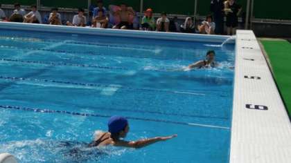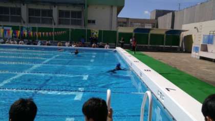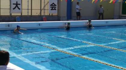 続いて、女子25mウォーキング第1レースのゴールと第2レースの様子です。このレースは、泳がずに歩いてゴールを目指します。第1レースは3年生、第2レースは2年生が1着でゴールしました。
