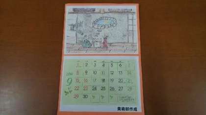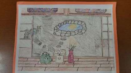 和室の中から見える夜の庭を描いています。欄間(らんま 日本の建築様式で、採光、通風、装飾といった目的のために天井と鴨居との間に設けられる開口部材。)、月見団子、ススキなどが描かれています。外を見ると鹿脅し(ししおどし 農業などに被害を与える鳥獣を威嚇し、追い払うために設けられる装置)や池があり、池の水面にはぼんやりと満月が映っています。細かい演出ですね。