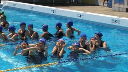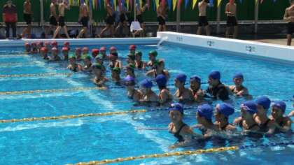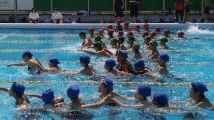 ここから団体種目の様子です。まずは、女子ムカデ競争、歩いて往復します。身長が高い方が有利なようです。3年生がリードしています。