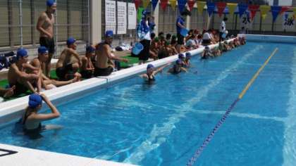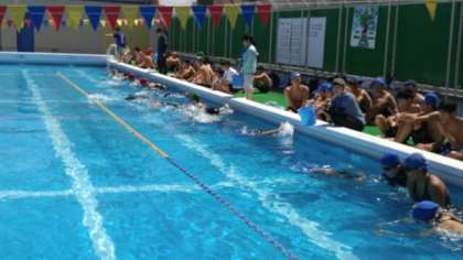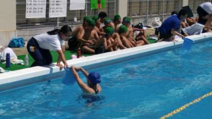 いよいよ最後の種目となりました。女子碁石拾いの様子です。プール内にまかれた碁石をどれだけ拾えるかを競います。プールサイドで待ち構えている人の持っているバケツにどんどん拾った碁石を入れていきます。