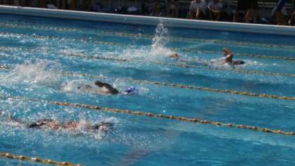 25mで折り返し、リードされていた第3コースの選手と並びました(写真2枚目)。ほぼ同時にゴールしました。