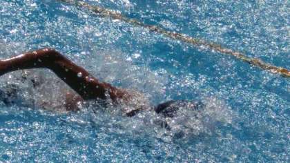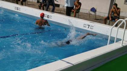 接戦です。25mで折り返し、力強い泳ぎのままゴールしました。全体で14人中の6位に入りました。
