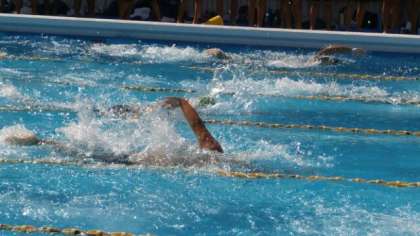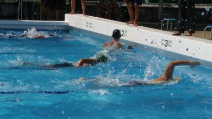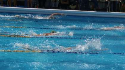 第1、第4コースの選手と接戦です。そのままほぼ並んだ状態でゴールしました。