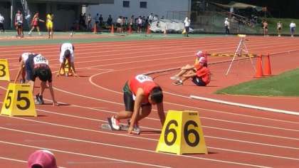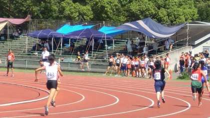 陸上部は、この日、1年生女子走り高跳び、2年生女子円盤投げ、1年生女子砲丸投げ、1年生男子1500m、1年生女子4×100mリレー、共女子(1年生だけではない選手で編成されたチーム)4×100mリレー、共男子4×100mリレーに出場しました。写真は、1年生女子4×100mリレーの様子です。第1走者がスタートしました。