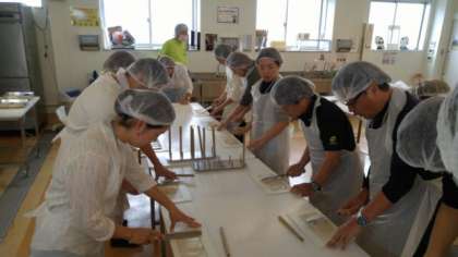 次に、ちくわ作りです。魚のすり身を型にはめて成型したものを棒で巻いていくだけなのですが、意外と難しく、器用にさっと仕上げる人もいましたが、悪戦苦闘の末、館の方の応援を仰ぐ人もいました。日本の伝統食作りを体験することができました。。