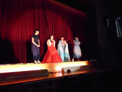 女子による劇が始まりました。きれいな衣装、くっきりした背景画が目を引きます