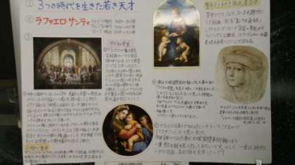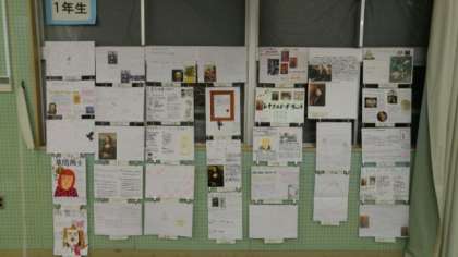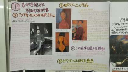 続いて多目的室の展示、まずは1年生美術科の「画家調べ」レポートです。写真のモディリアーニ、ラファエロの他、レオナルド・ダ・ビンチ、ゴッホ、葛飾北斎、水木しげるなどもありました。