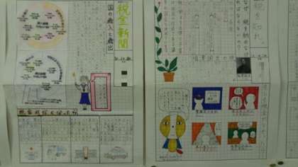 3年生社会「税新聞」です。「税金新聞」「税を知れ。」「税金大切だよ新聞」「税のアレコレ」などのタイトルが見られました。