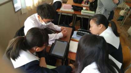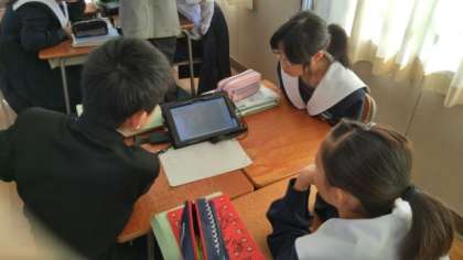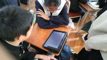 それぞれのグループが撮影した回答にタッチペンを使って「どのようにして75度を作ったか」を説明、他のグループがその説明をタブレットを通して聴きました。