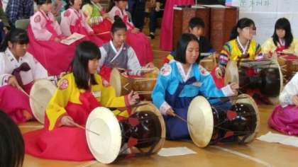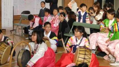 プログラムの最後、7校の中学生が合同で「サムルノリ」を演奏しました。