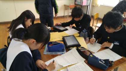 内容は、「今までに学んだ表現を使って、自分の中学校生活についての作文を書く」ということでした。わからない単語はタブレットの翻訳ソフトを使ってい調べます。
