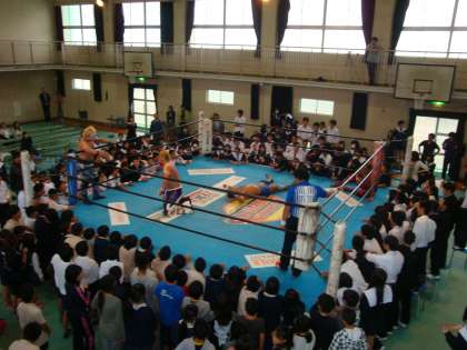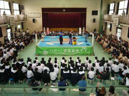 本日午後から『いじめ撲滅プロレス』の取組をを本校体育館で行いました。いじめ撲滅に取組んでいるプロレス団体をお招きして、代表である大谷晋二郎選手の熱い講演のあと、実際のプロレスの試合を2試合観戦することができました。会場がとても盛り上がり「大谷コール」が沸き起こり、子どもたちがリングの周りに駆け寄っていく姿などがありました(写真右)。後日、トップ画面のスライドショーで本日の様子を掲載します。