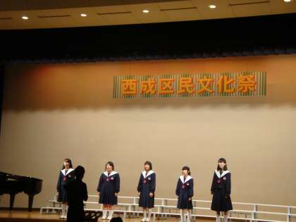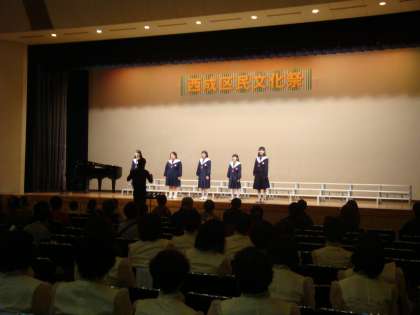 11月1日(土)に西成区民センターで『西成区民文化祭』が開催されました。本校からは、音楽部とPTAコーラスが参加しました。写真は、音楽部の演奏の様子です。3年生が引退して5名と部員数は少ないものの、会場に響いた美しい歌声は観客を魅了しました。