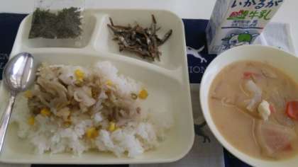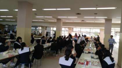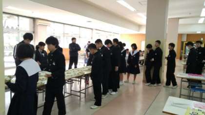今年最初の給食の様子です。献立は、「レンコンのちらし寿司、ごまめ、雑煮、牛乳」でした。写真は、1年生の「いただきます」と2年生の並んで給食を受け取りに行く様子です。