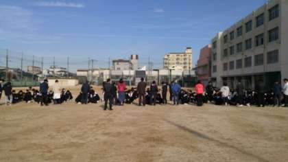 1,2時間目に通常授業を行った後、3限には避難訓練を実施しました。写真は、集団下校のため居住地区ごとに集まっている様子です。