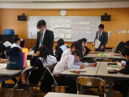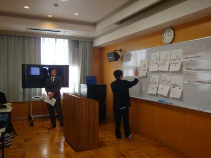 昨日行われた新任教員研修会(数学科)の公開授業での子どもたちの様子です。おおぜいの先生方の参観もあり、いつもの教室とは違う多目的室での授業でもあり、やや戸惑いがあったようです。